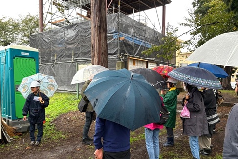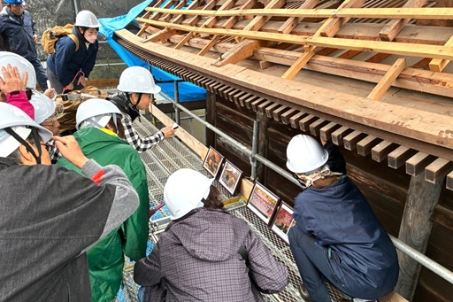 福島県指定文化財では、補助事業として修理工事が行われる場合に、現場見学会や講演会などの活用事業を行うことが条件として付されます。このため、10月26日(日)に現場見学会が行われました。事前申込制とし、各回10名程度、5回の見学会で募集しました。当日はかなりの大雨であったにも関わらず、約30名の参加者がありました。